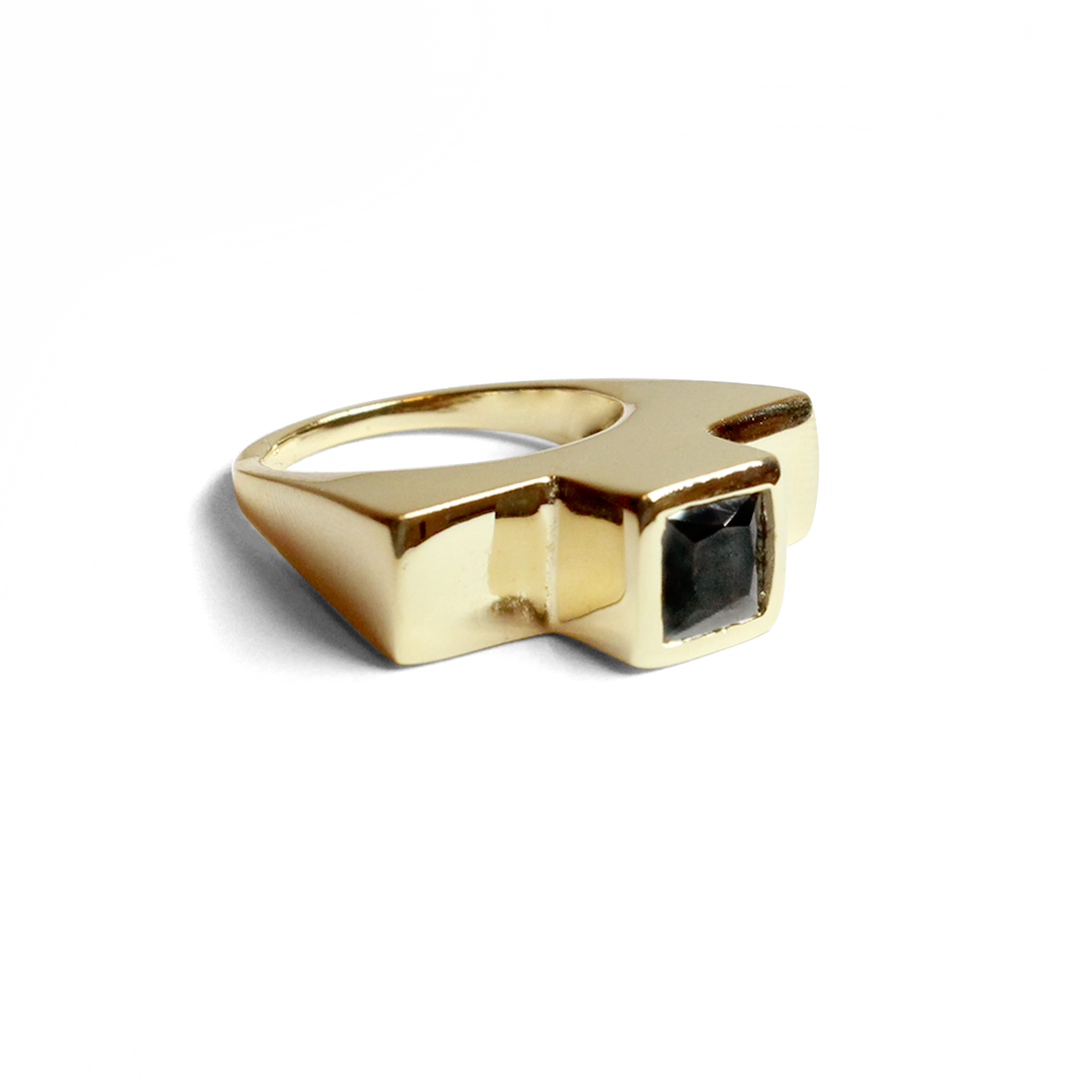 18k. POLISHED GOLD PLATED (3 MICRONS) RING WITH BLACK CIRCONITE STONE