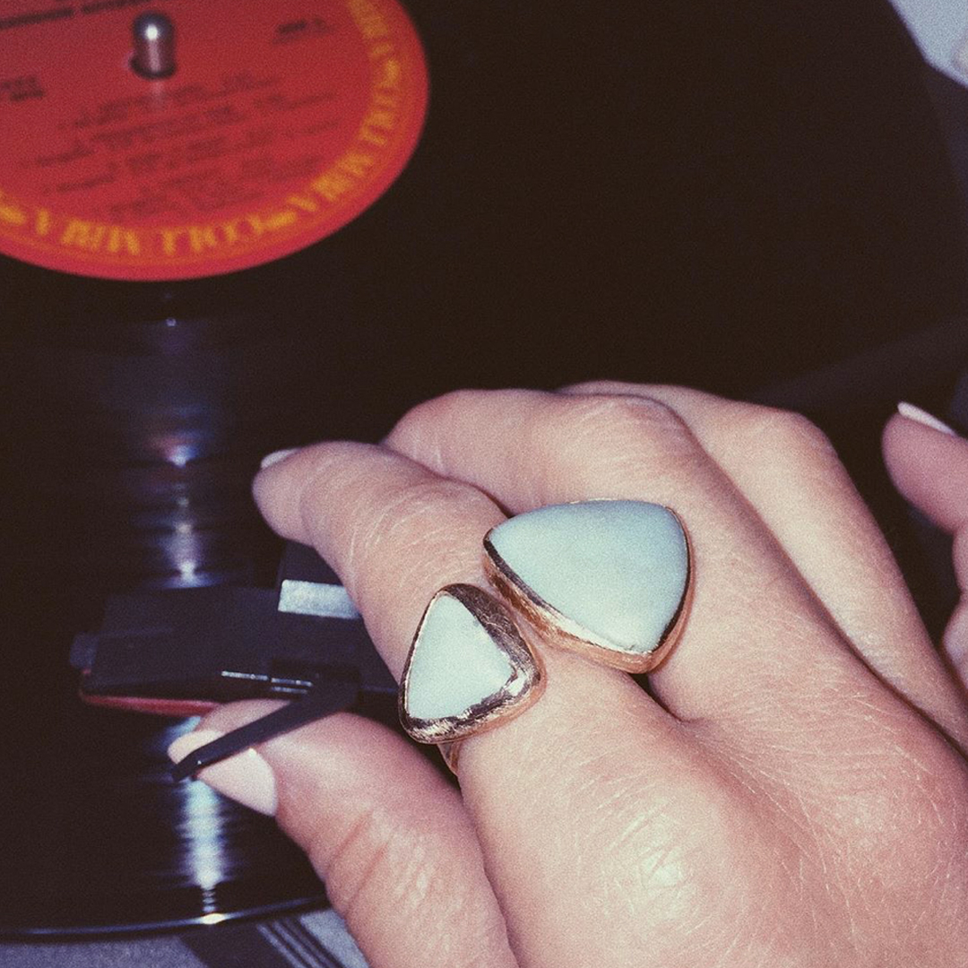 La pedra gran medeix 1,8cm i la pedra petita 1cm. Les pedres no són completament regulars, per tant, la mida de cada pedra pot variar lleugerament d’un anell a una altre, tot i tenir la mateixa referència. Això fa de cada anell una peça única.